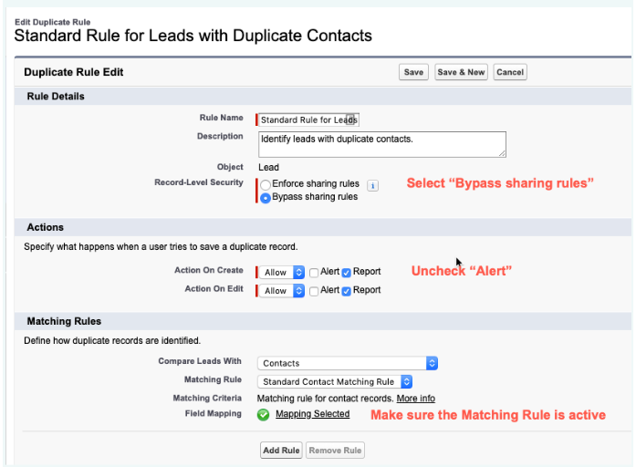 - You must uncheck both of the “Alert” boxes on the Duplicate Rule, because these will prevent the Lead Conversion and Touch Point Configuration functions from working.