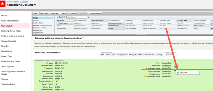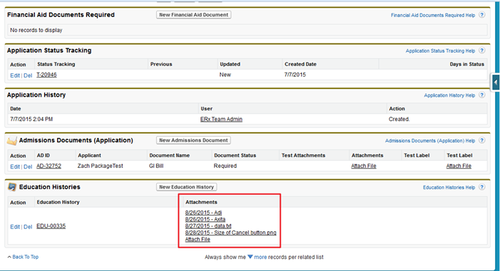 - Use the newly created formula field called Attachments in your page layouts and related lists (e.g., the Education History related list on the Application page layout).