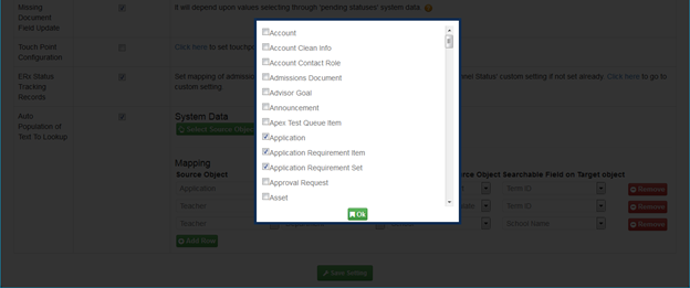 Select Source Objects: To populate the items in the Source Object drop-down, click on this button which will bring up a list of objects. Put a check on those which should be populated.