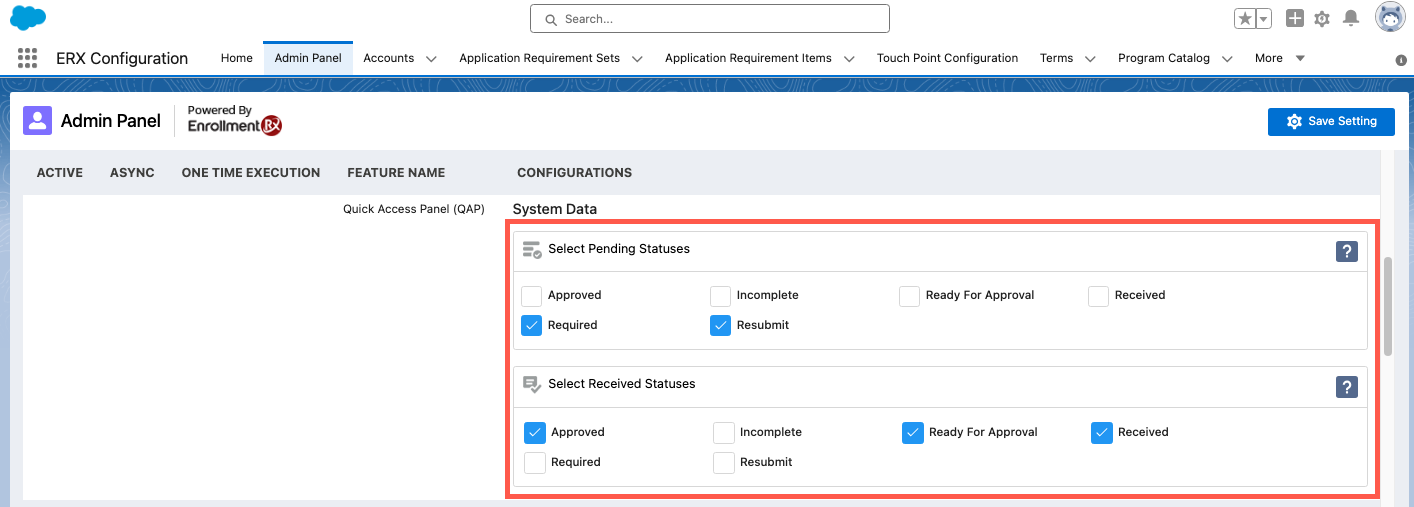 - Item’s Document Status is equal to one of statuses selected through “Select Pending Statuses” in the Admin Panel’s “Quick Access Panel” section, configured as shown here:
