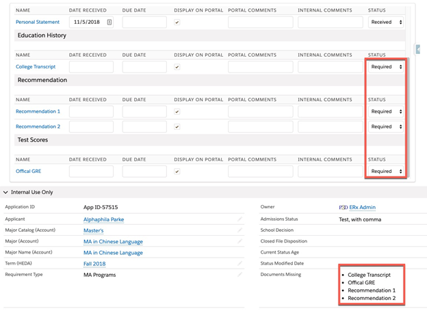 Whenever the Application is saved, the ‘Document Missing’ field is automatically populated with the display names of these items that meet the following conditions: