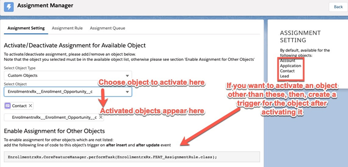 - To Activate an object for assignment, in the Assignment Setting tab, find the object