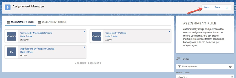 NAME_APEX_TRIGGER_HERE,ADD_OBJECT_API_HERE__candNAME_TEST_CLASS_HERE.Sample Apex Trigger:trigger NAME_APEX_TRIGGER_HERE on ADD_OBJECT_API_HERE__c (after insert, after update) { EnrollmentrxRx.CoreFeatureManager.performTask(EnrollmentrxRx.FEAT_AssignmentRule.class; }Sample Apex Test Class:@isTest public class NAME_TEST_CLASS_HERE { static testMethod void unitTestMethod(){ try{ //Initiate Object //sobjectName variablename = new SobjectName(); ADD_OBJECT_API_HERE__c customObj = new ADD_OBJECT_API_HERE__c(); //insert statement insert customObj; //exception to handle any issue that occurs during insertion as we are not providing all values required }catch(exception e){} } } - To create a new Assignment Rule, click the New button while on the