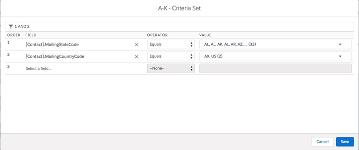 - Now, click the Criteria Set link on your rule entry and configure the criteria that will trigger this rule entry to assign the record owner. You can configure as many criteria as you need and join them in a logical expression at the top of the screen like this: