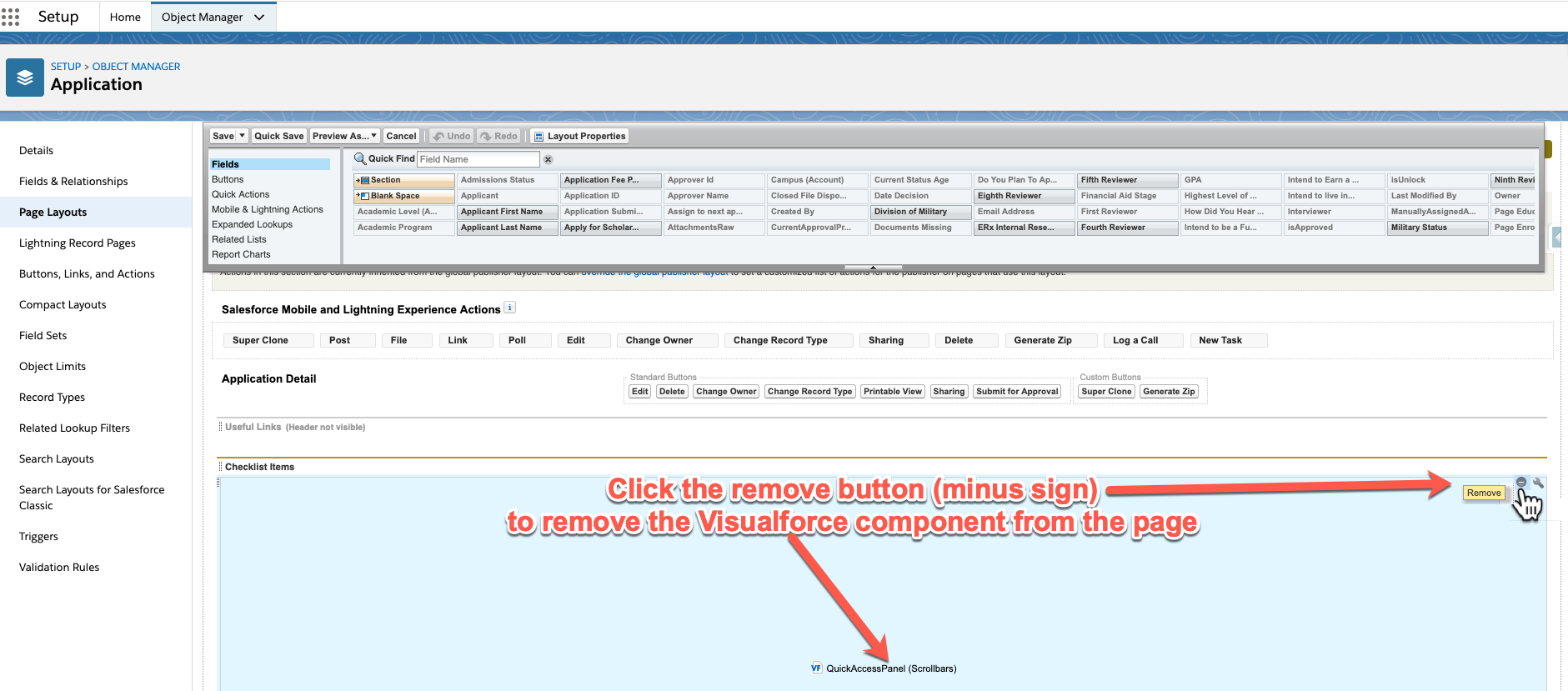 To remove the Quick Access Panel from the Classic page layout and to add the Lightning Web Component named ERX Checklist Requirement Quick Access Panel to the Application Lightning page layout, please follow these steps: