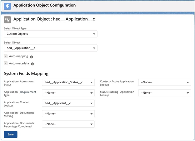 - Map any fields already on the object that can play the roles of the required fields. In the case of the EDA Application object, it already has a lookup to the Contact and an Admissions Status picklist, so these can be used to play these roles—we have selected them to do so in the screenshot, above.