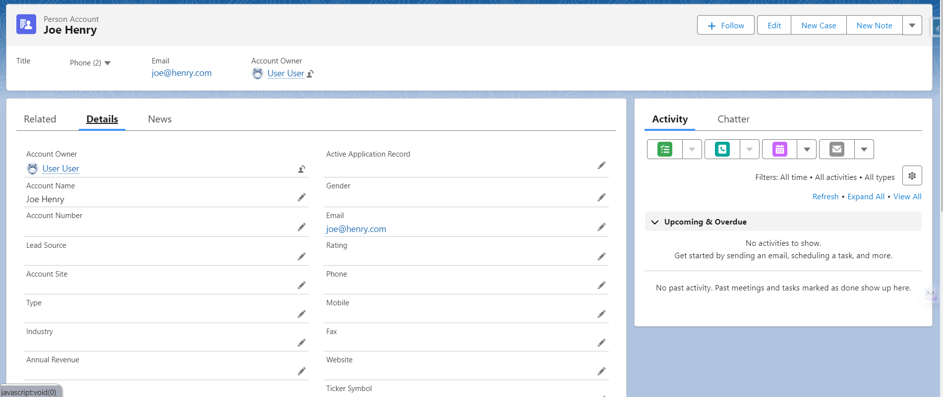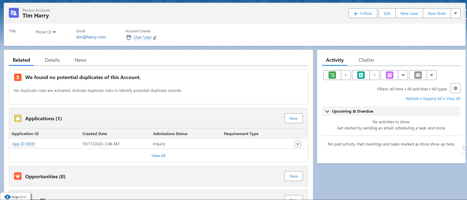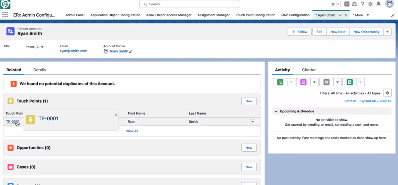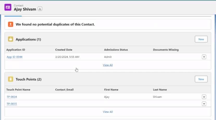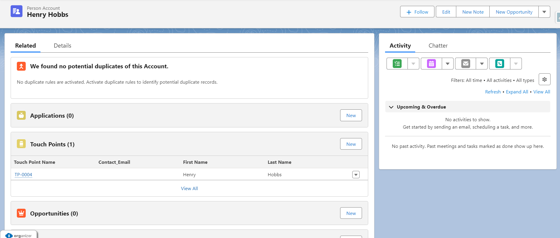 - The Touch Point records for Lead, Application, and other related Custom Objects will be created on the Person Account record