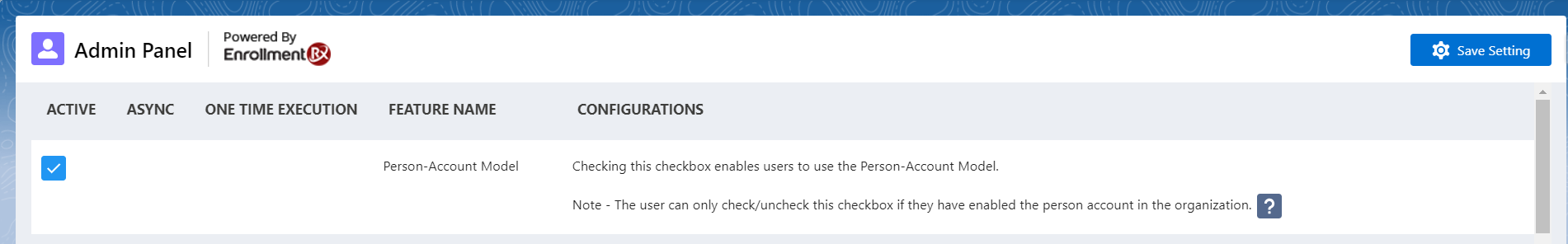 - On the Admin Panel tab, the Person Account Model checkbox will remain disabled until Person Accounts are enabled in the Salesforce org.