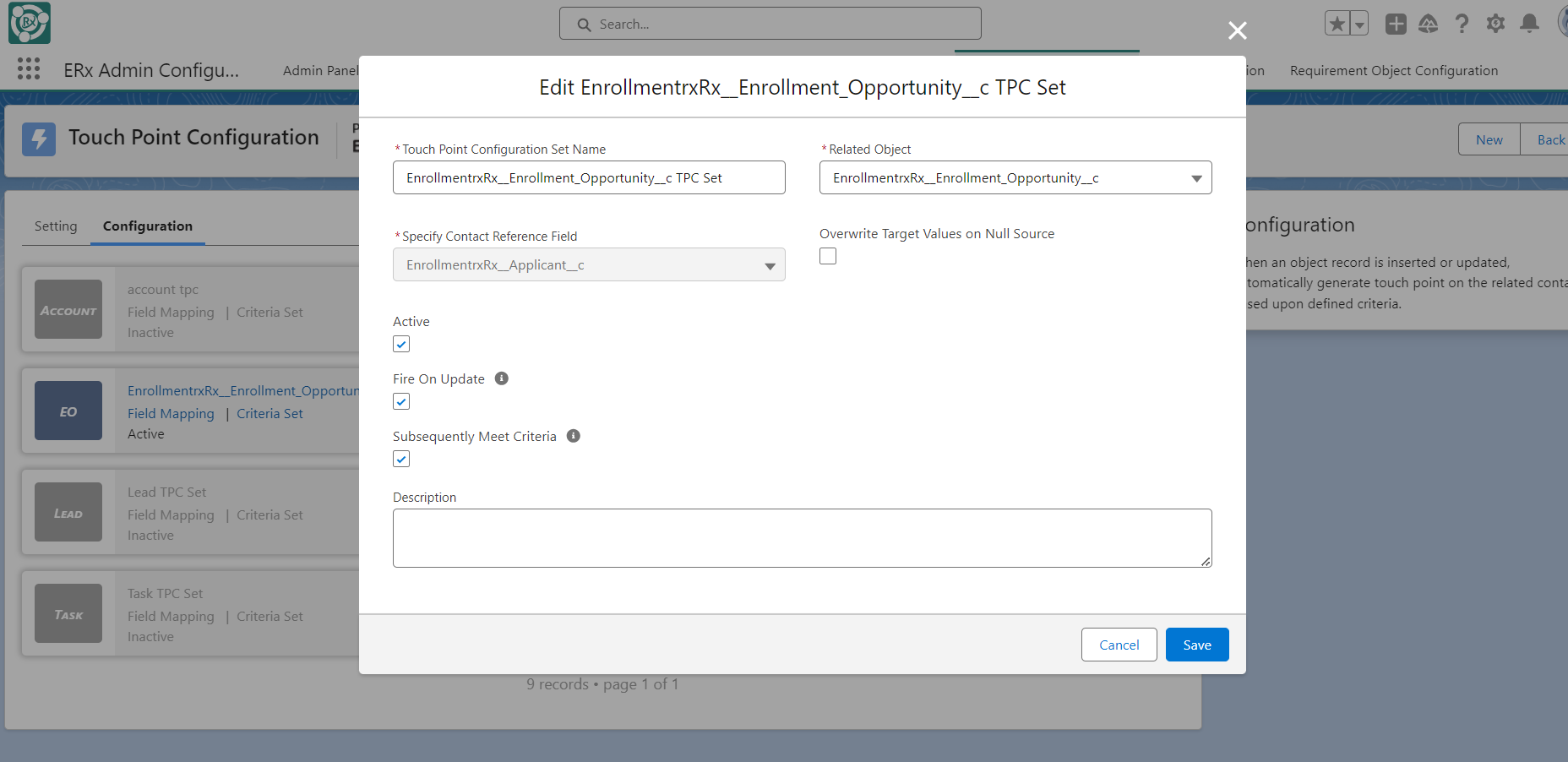 - Overwrite Target Values on Null Source: While upgrading ERX Core, you need to add the Update Null Value checkbox to the Touch Point Configuration Set Object page layout.
