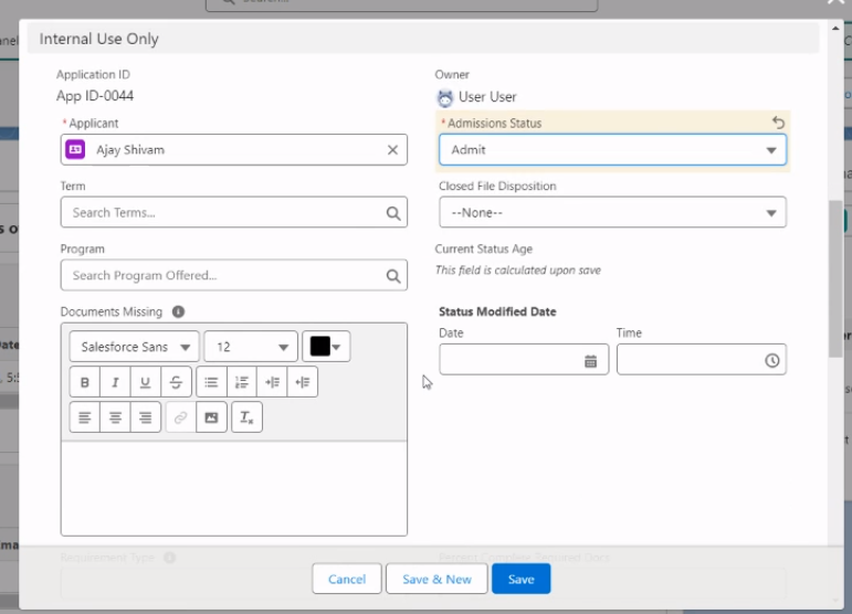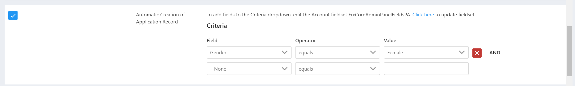 - Automatic Creation of Application Record on Admin Panel: Fields from reference objects (e.g., ContactId) should not be added to the field set, as these will not be shown on the criteria field picklist. Instead, create a formula field to use in the criteria field drop-down list.