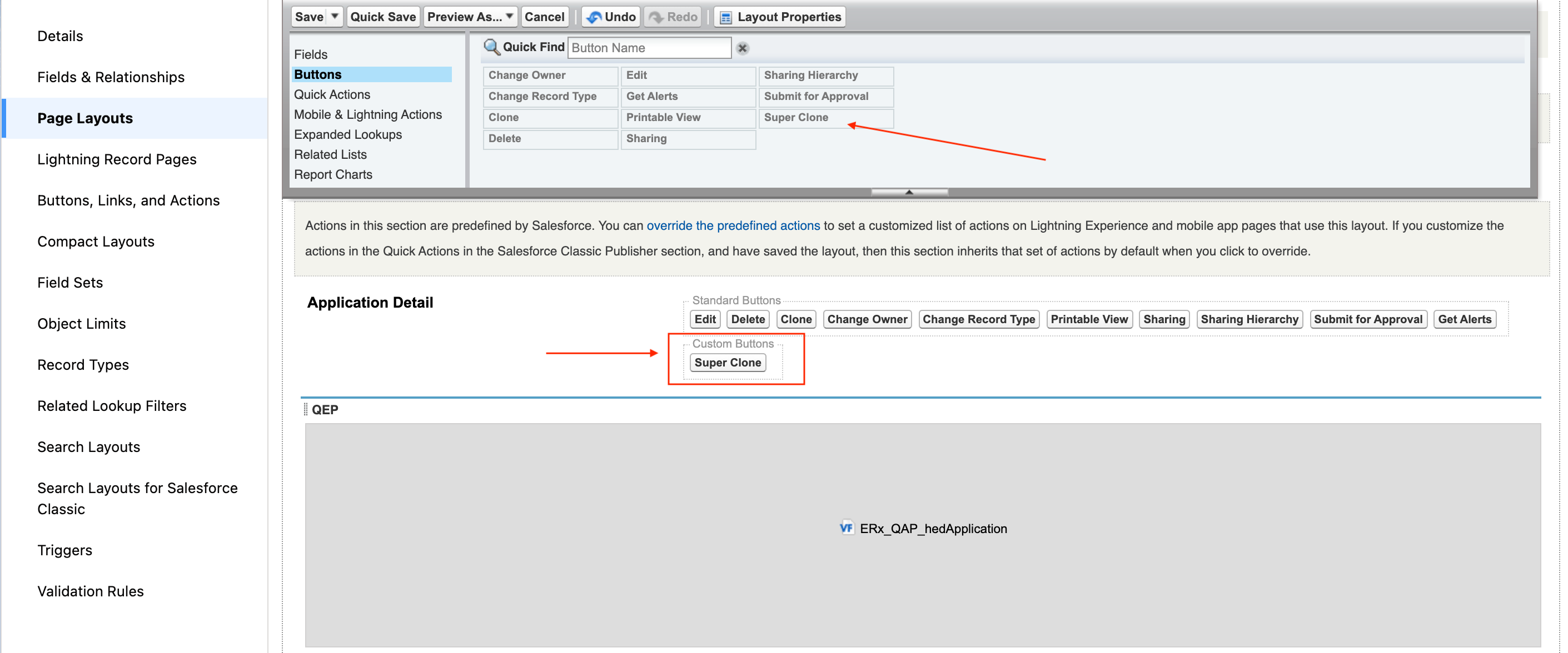 - Edit the custom application's page layout by dragging and dropping the Super Clone button to the Custom Buttons area under Application Detail