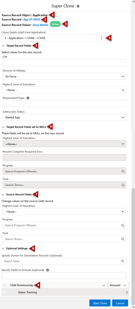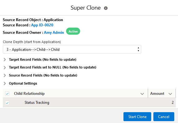 - Target Record Fields: You'll need to change at least one field before the "Start Clone" button is clickable.