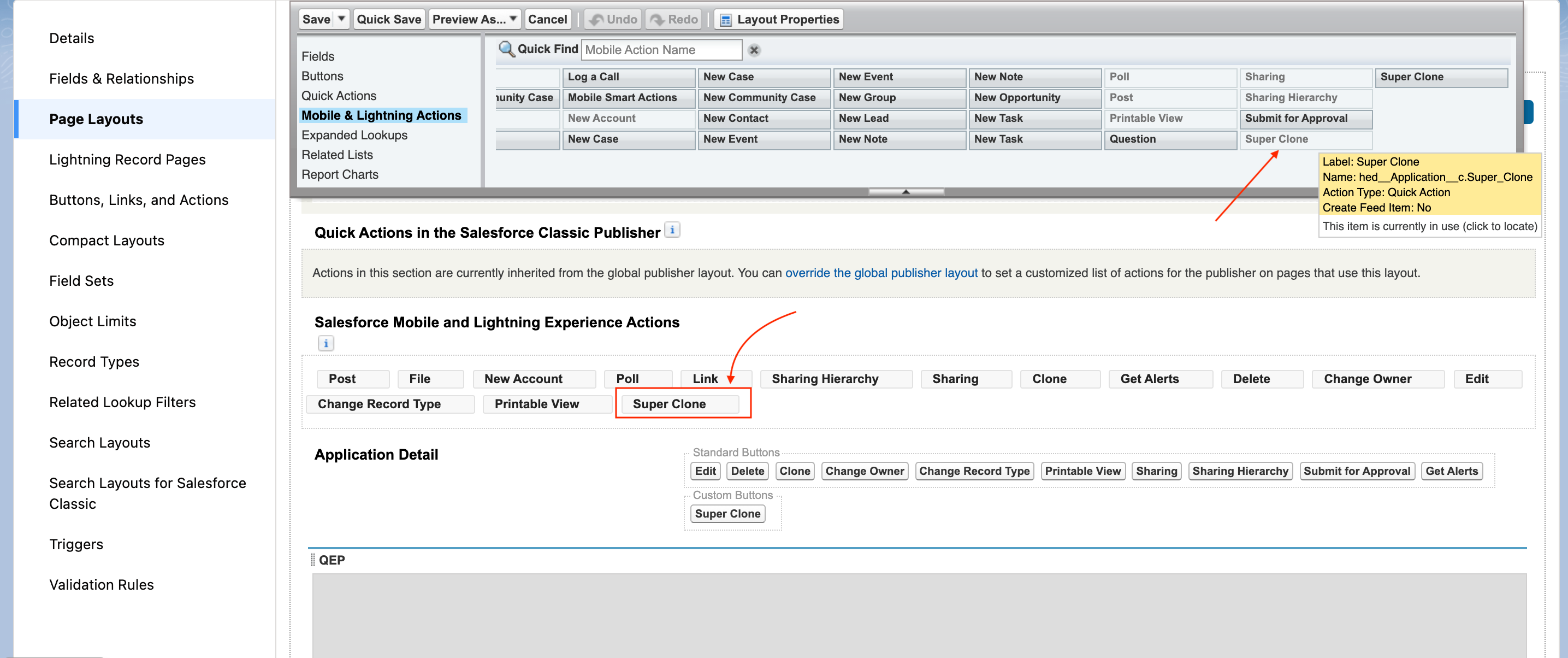 - Click Mobile & Lightning Actions in the field palette, and drag and drop the Super Clone button to the "Salesforce Mobile and Lightning Experience Actions" on the page layout