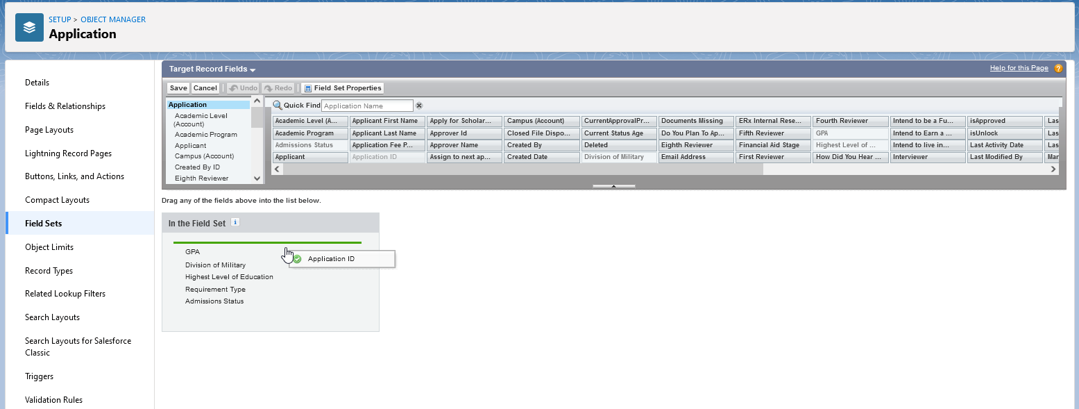 - Click Save. This takes you to a page where you can add the fields to the Field Set by dragging and dropping them.