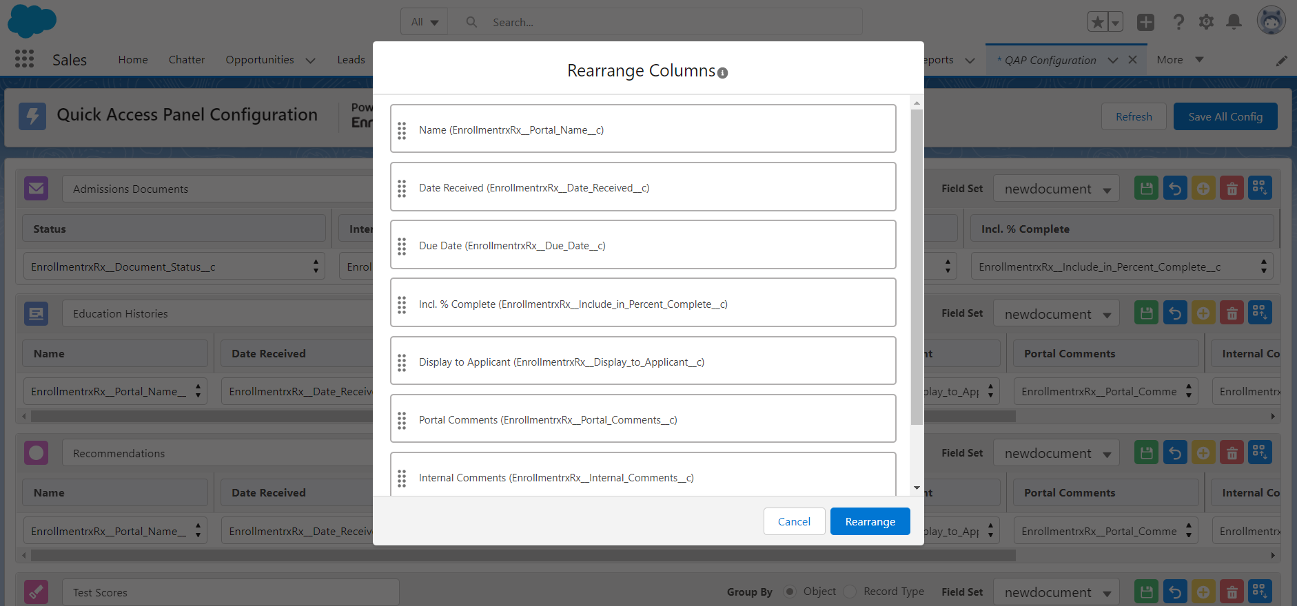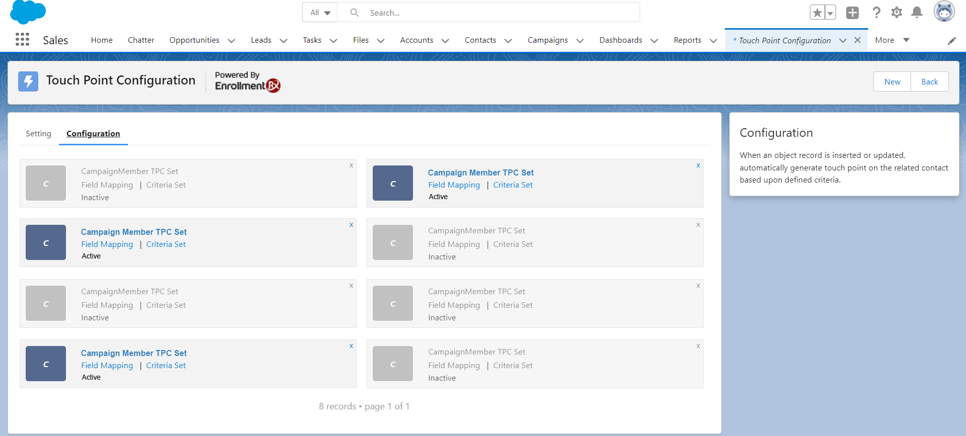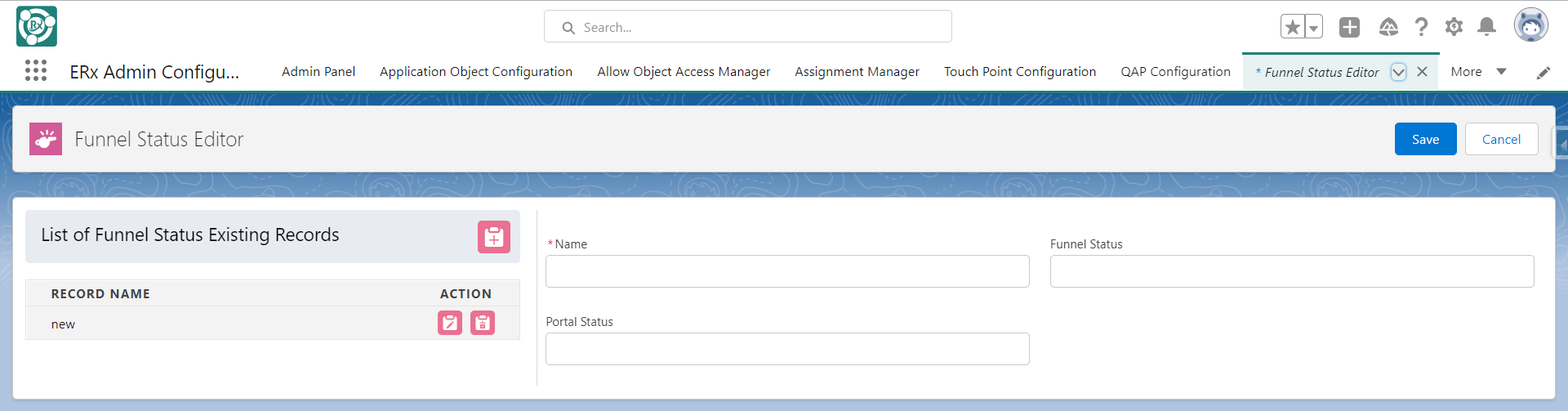 - A Lightning page called Funnel Status Editor displays funnel setting records to edit