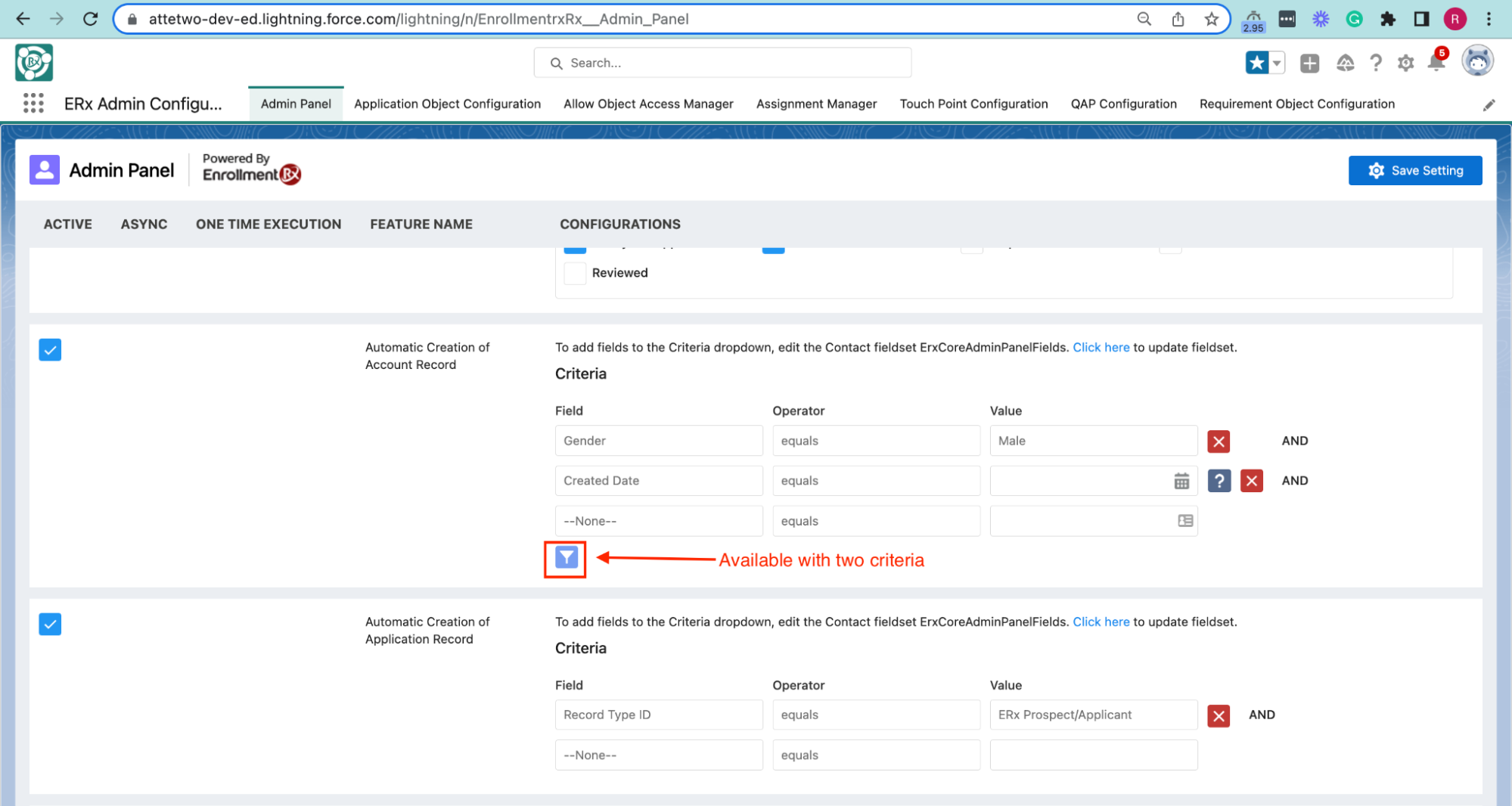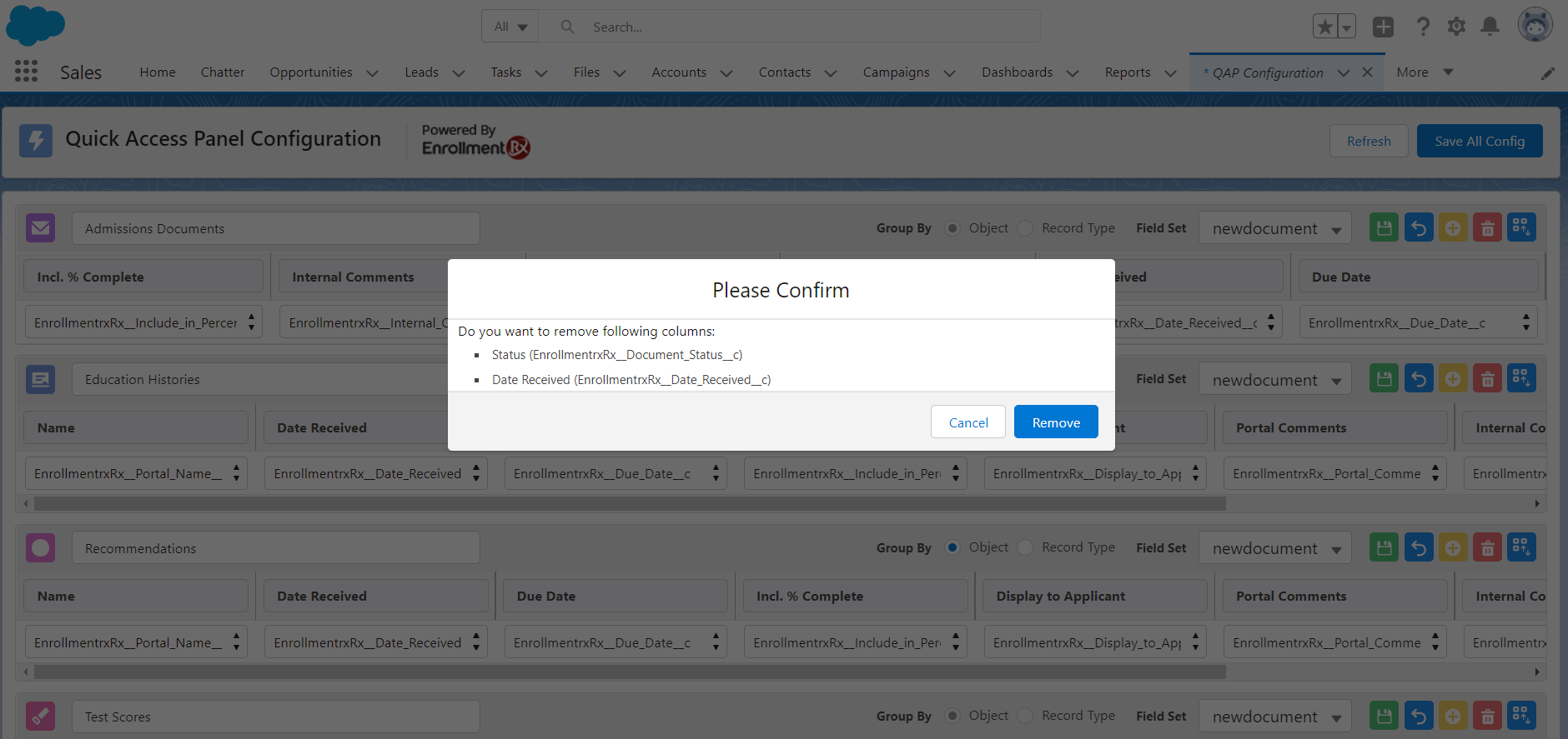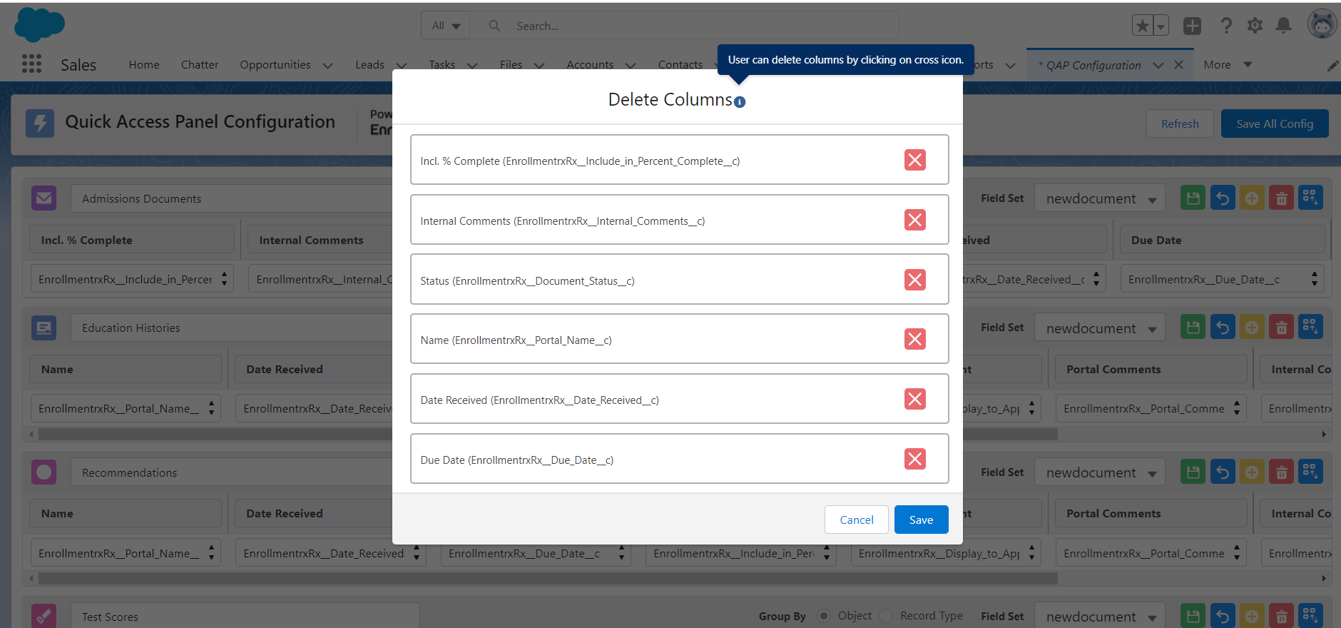 - A Lightning page called Funnel Status Editor displays funnel setting records to edit