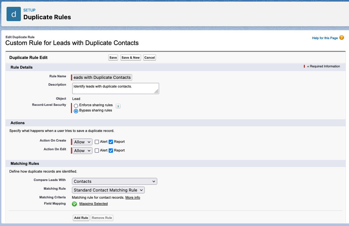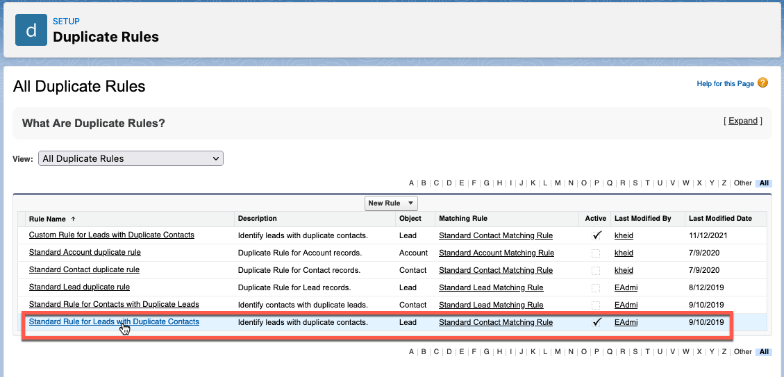 - On the Duplicate Rules page, click Standard Rule for Leads with Duplicate Contacts
