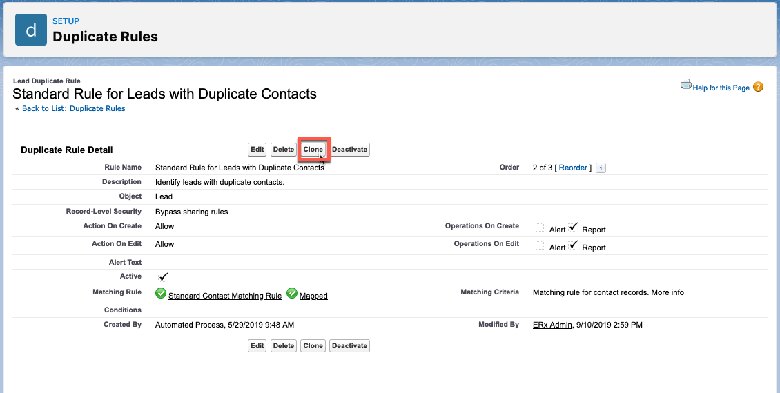 - On the Standard Rule for Leads with Duplicate Contacts page, click the Clone