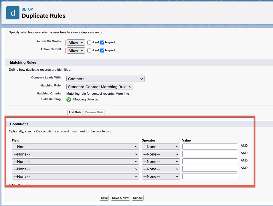 - A custom Duplicate Rule is used in place of the default Salesforce Standard Contact Matching Rule. (Please see below for a use case and screenshots.)