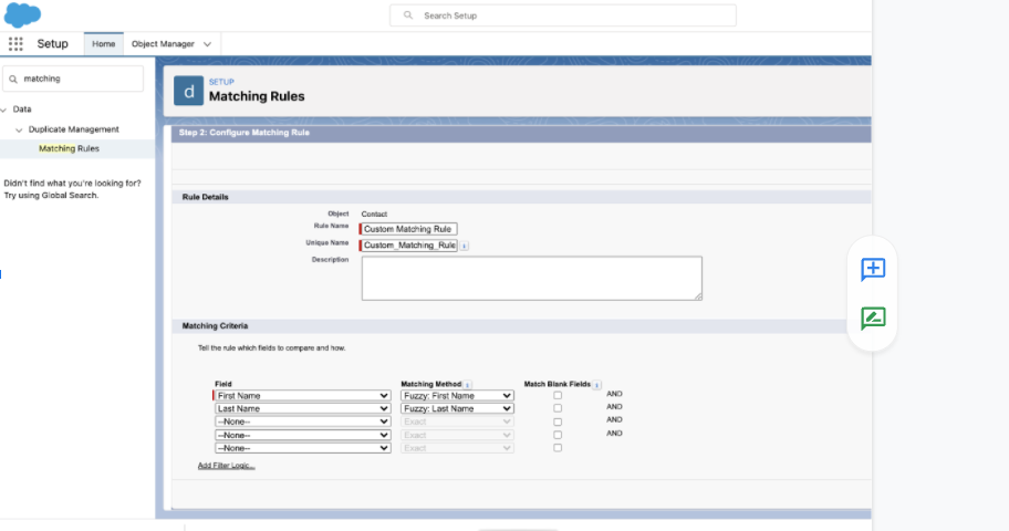 Once you are done creating your matching rule, you can associate it with a current or new Duplicate rule. Follow these steps: