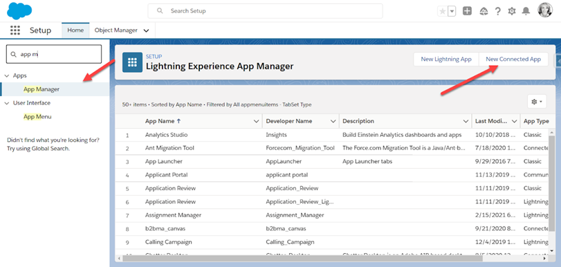 3. Create an Unmanaged Connected App by going to Setup > App Manager > New Connected App: