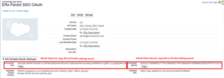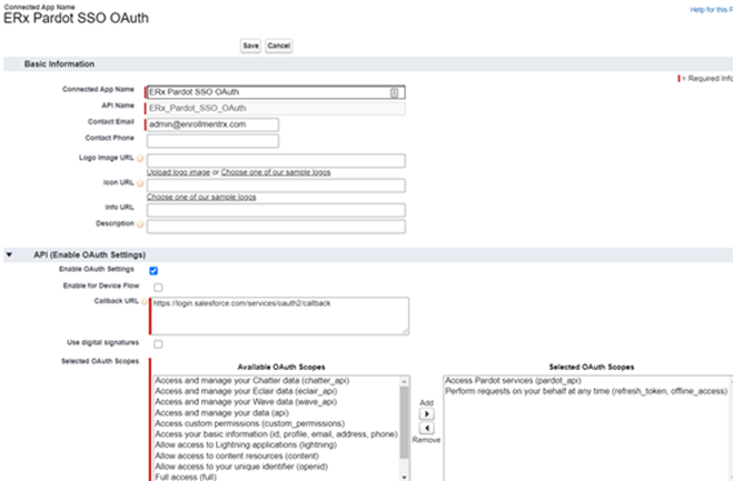 Selected OAuth Scopes: Access Pardot Services (pardot_api) and Perform Requests on your behalf anytime( refresh_token_offline_access)
