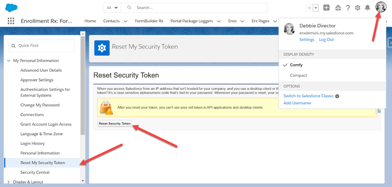Retrieve the Security Token by going to your user Icon >Settings >Reset My Security Token, and click Reset Security Token: