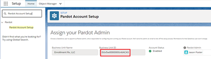 In a separate tab go to Setup, type in “Pardot Account,” and grab the business ID.