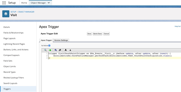 To do this, you will need to create an Apex Trigger on Visits (or any other object) that invokes the feature. You must create a trigger in one of your sandbox orgs and then deploy it to your production org. A trigger on Visits, for example, should contain this code: