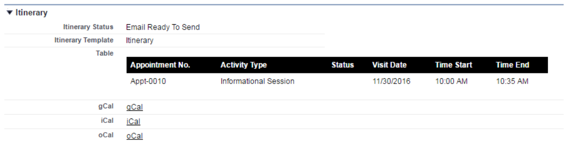 Calendar and cancel links are available on the Visit record. These fields can be merged into the email template that is sent to the registered Contact.