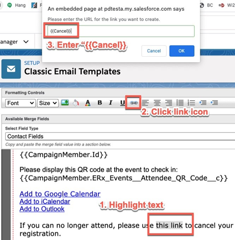 these links must be {{iCal}}, {{oCal}}, {{gCal}}, and {{Cancel}}: Remember:The "C" in the {{Cancel}} link should be uppercase in the Event Confirmation Email and lowercase in the Event Reminder Email