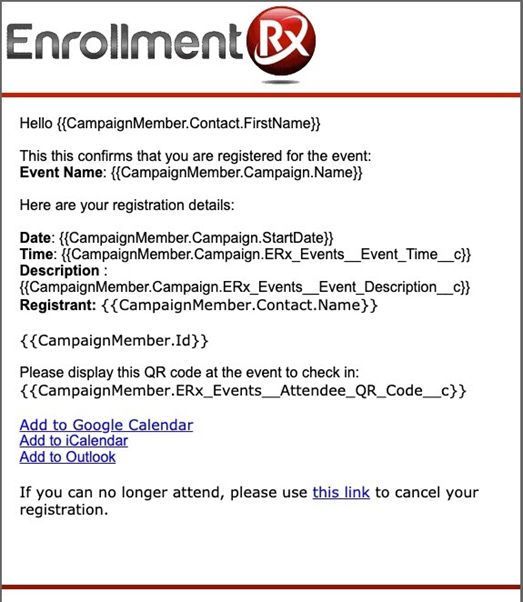 - To include iCal, oCal, gCal, and Cancel links in the Email Template the URL for
