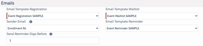 - The three “Email Template” pick lists contain all and only the Email templates stored in the Classic Email Templates folder called “Erx Event Registration Custom Email." You can copy the SAMPLE templates in that folder to create your own.