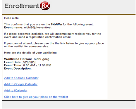 Wait-list status confirmation email snapshot