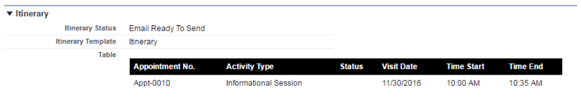 A generated itinerary table. Note that the value of”Itinerary” in the Itinerary Template field matches the name of an email template used in the “Manage Visitor Lists” configuration.