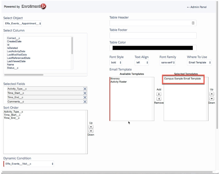 Here is the Table Configuration that is attached to the above Campus Sample Email Template.