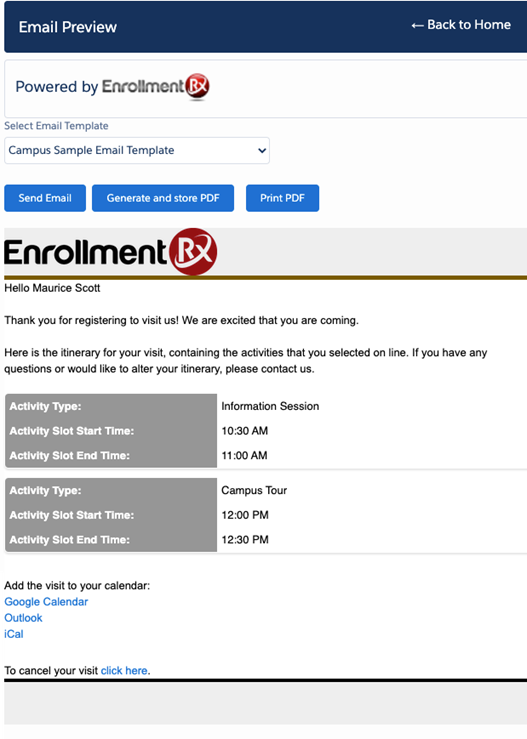 PDF Itinerary provides the functionality of generating the visitor’s schedule of Visit Appointments, embedded in an email template.