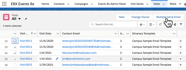 Click on the Visit Tab, then filter and use the checkboxes to select the Visit records for which you wish to send Itineraries and then click on the Multiple Send Email button.