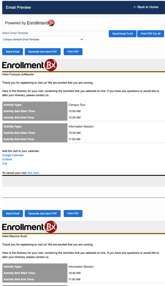 You can click the "Send Email to All" and "Print PDF for All" buttons, or, you can click buttons on the individual emails: "Send Email," "Generate and Store PDF," and "Print PDF for All."