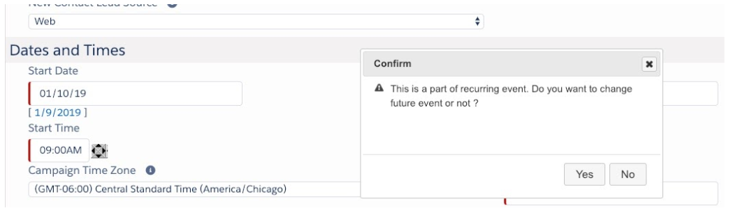 - If you select ‘Yes’ then all future events will be deleted and the child campaign’s parent will be removed. At this point the child campaign can have its own recurrence.
