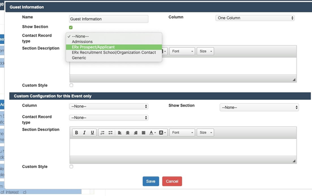 - You can set the Record Type of the Guest Contacts by double clicking the header of the “Guest Information” section and choosing from the “Contact Record Type” picklist like this:
