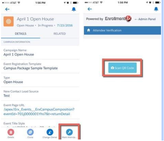 - From the Salesforce Mobile app for iPhone or Android, navigate to the Campaign for which you wish to take attendance and click the “Mark Attendance” quick action at the bottom of the screen, then click the “Scan QR Code” button. The camera will open for you to scan the code.