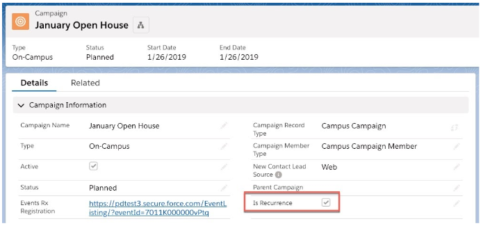 Here, the “Is Recurrence” field is checked because the campaign is part of a series. This field is also checked on all of the child campaigns.