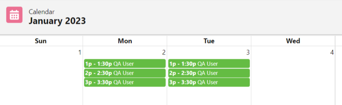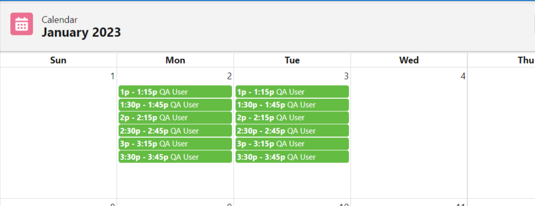 | 1/2/2023 | 1/3/2023 | 1:00 PM | 4:00 PM | 30 | 30 | All Day | The system creates 3 slots each day (30 minutes each with a 30-minute gap) as shown below |