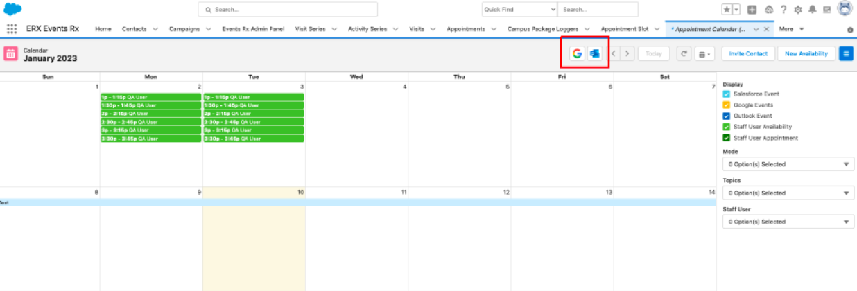 - Navigate to the Appointment Calendar to verify the Google and Outlook icons