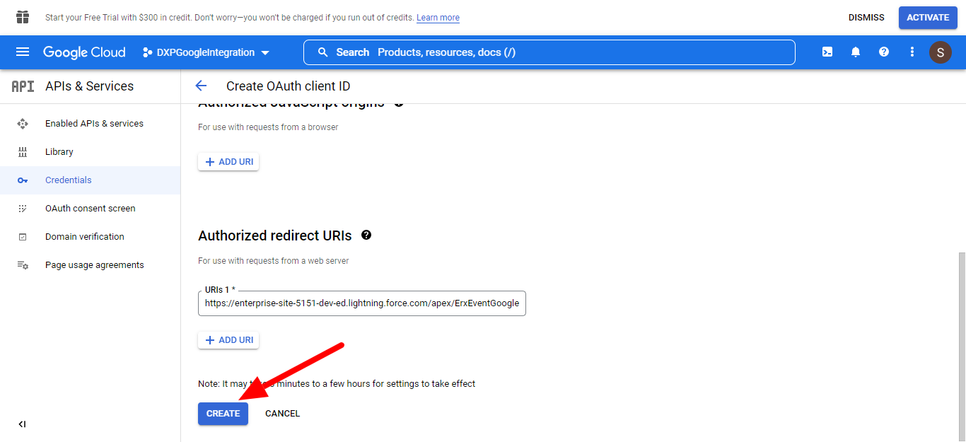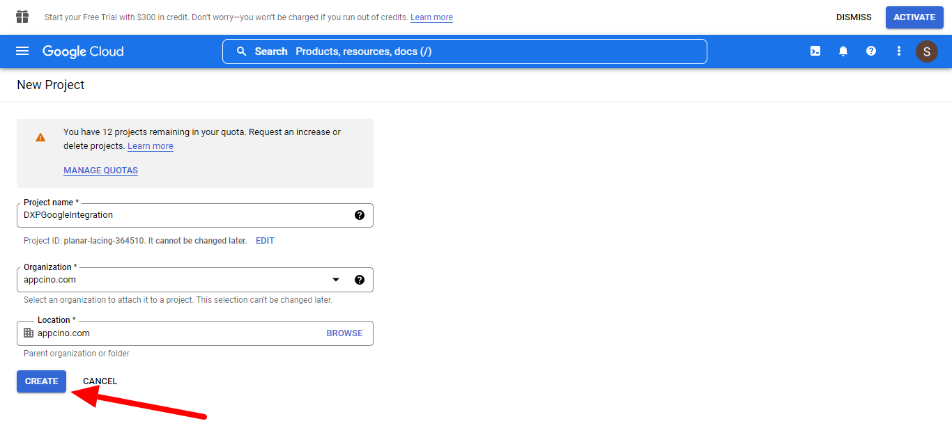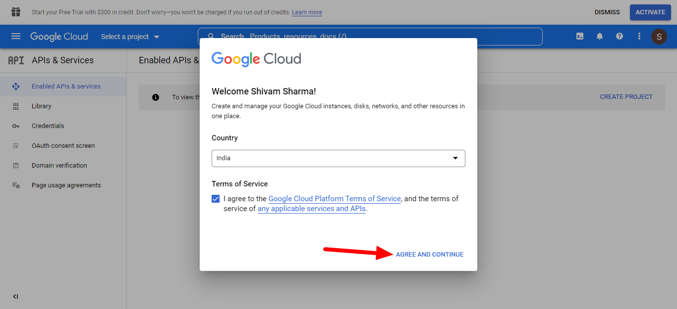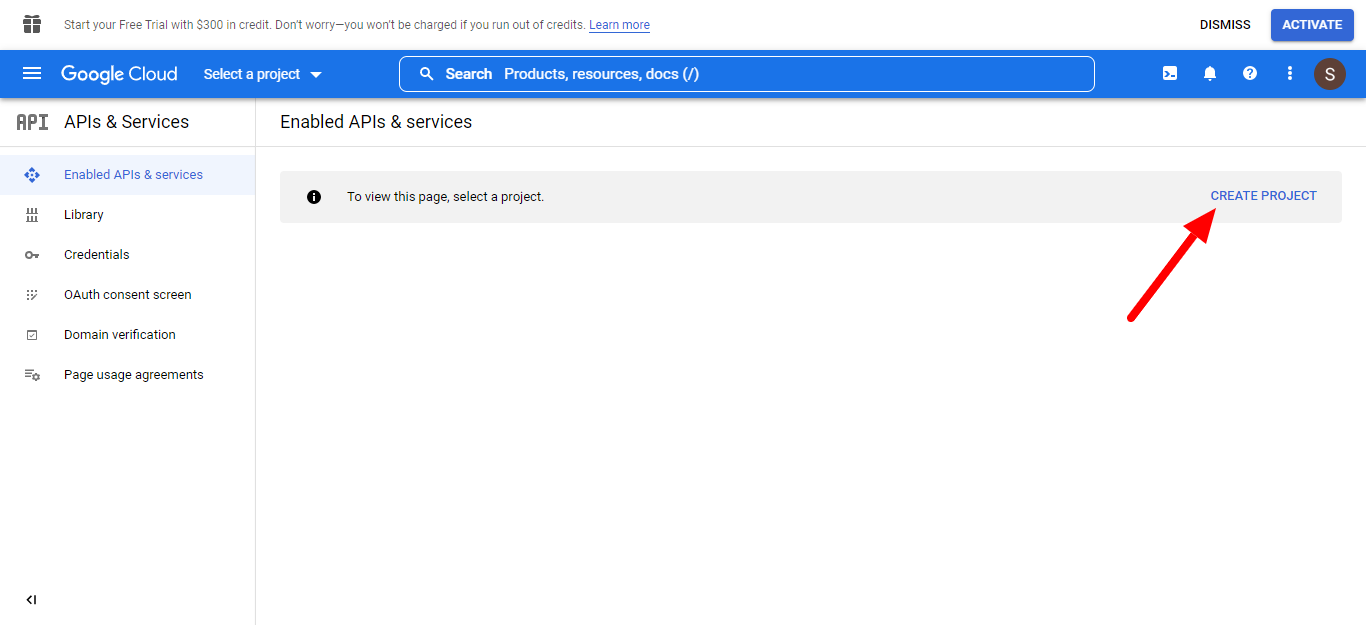 Note:You may or may not see this popup. - On the Google Cloud page, click the CREATE PROJECT button