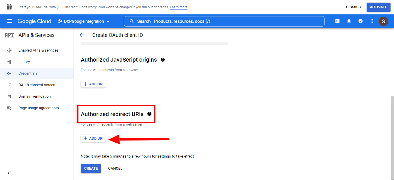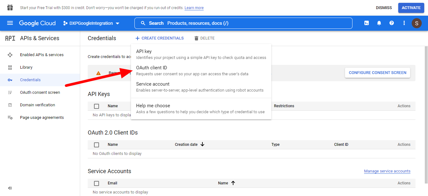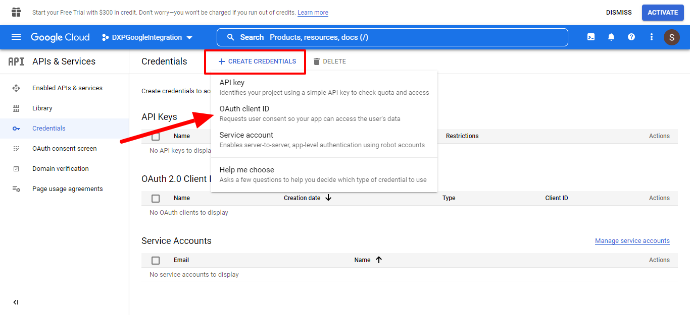 - Click CREATE CREDENTIALS and select OAuth client ID in the