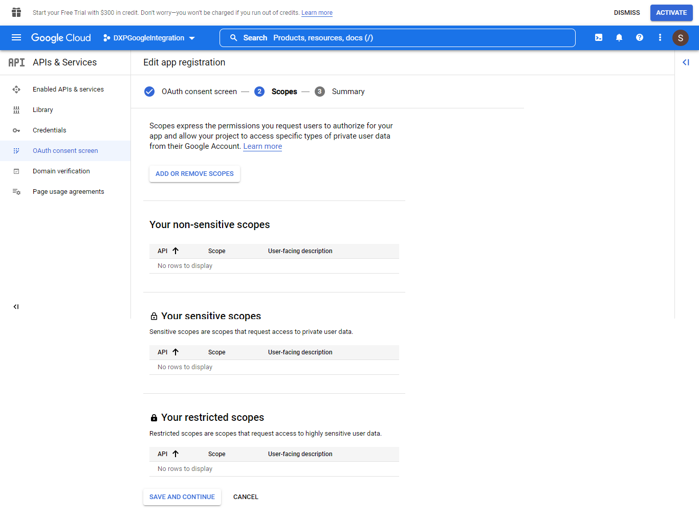 - Leave the Scopes page as it is and click SAVE AND CONTINUE