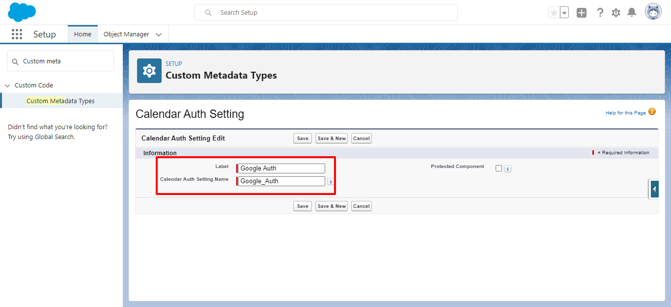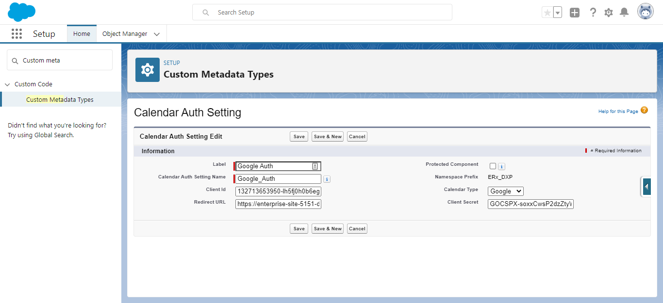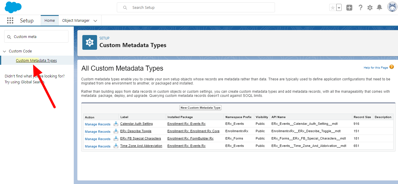 - On the All Custom Metadata Types page, click "Manage Records" next to "Calendar Auth Settings"