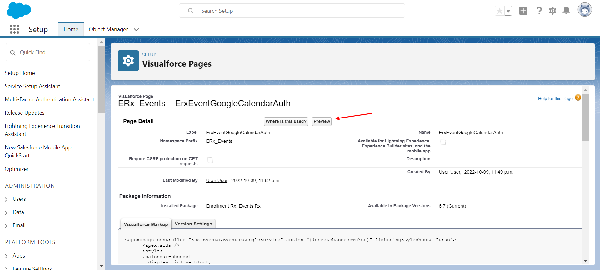 apex/ErxEventGoogleCalendarAuthNote:Example:https://enterprise-site-5151-dev-ed.lightning.force.com/apex/ErxEventGoogleCalendarAuth - Alternatively, you can go to your Salesforce org setup and search "Visualforce Pages" in the Quick Find box